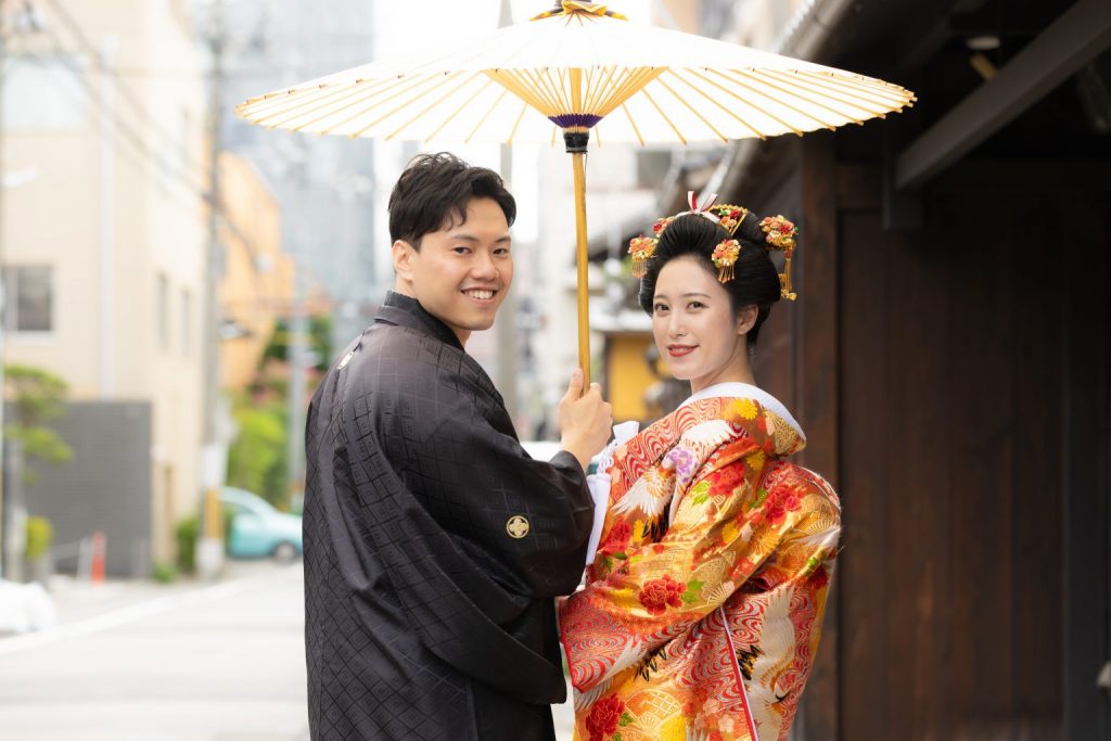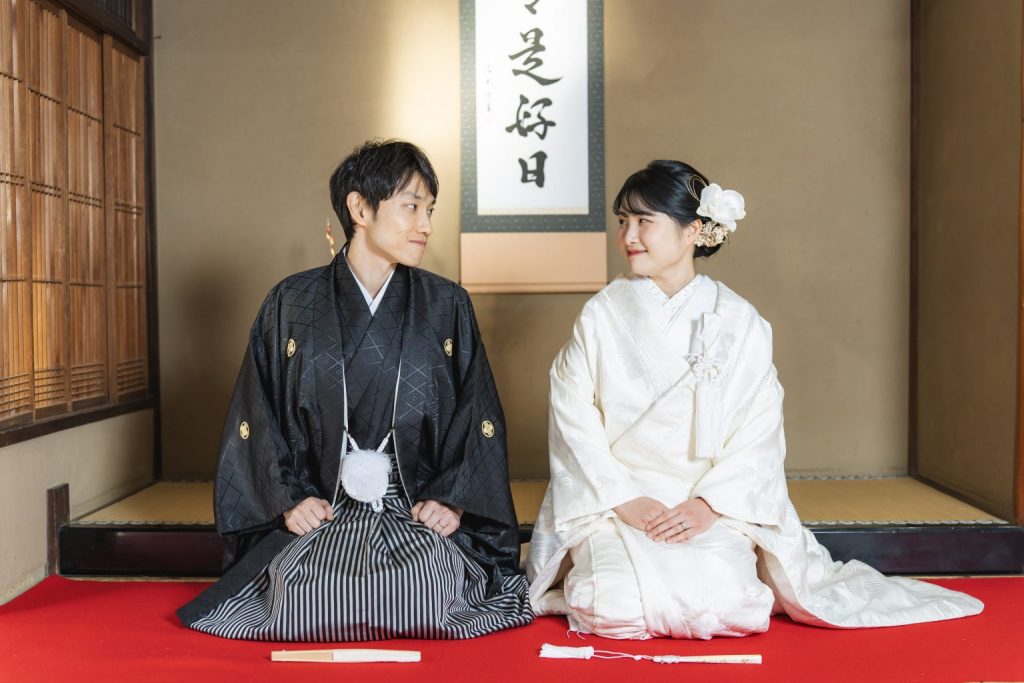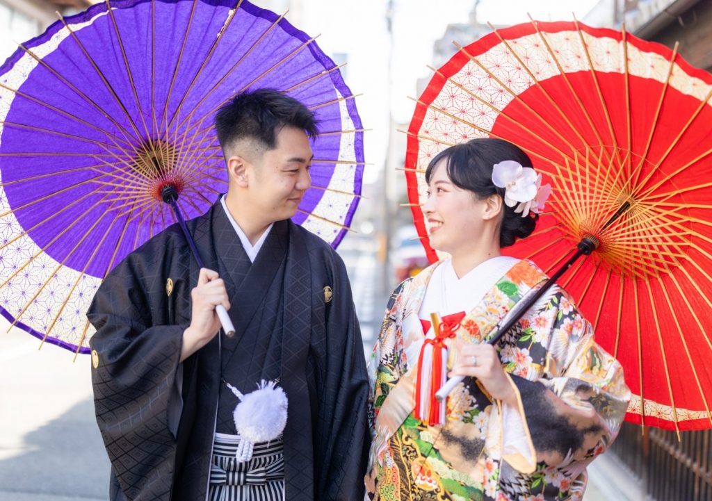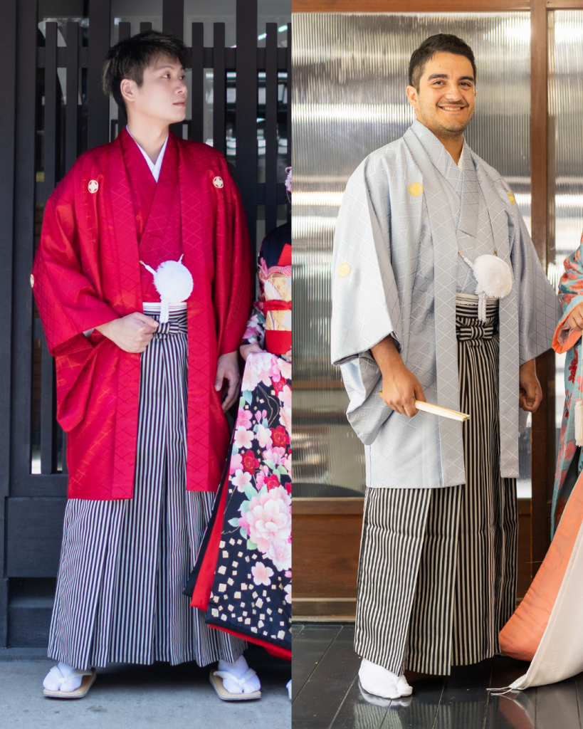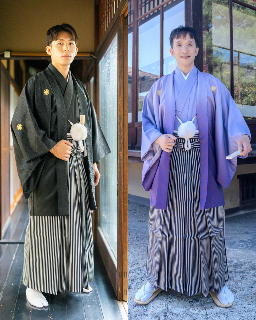 花婿様は紋付のみのご用意ですが、黒色以外に紫・青・白など様々な色の紋付をご用意しております。